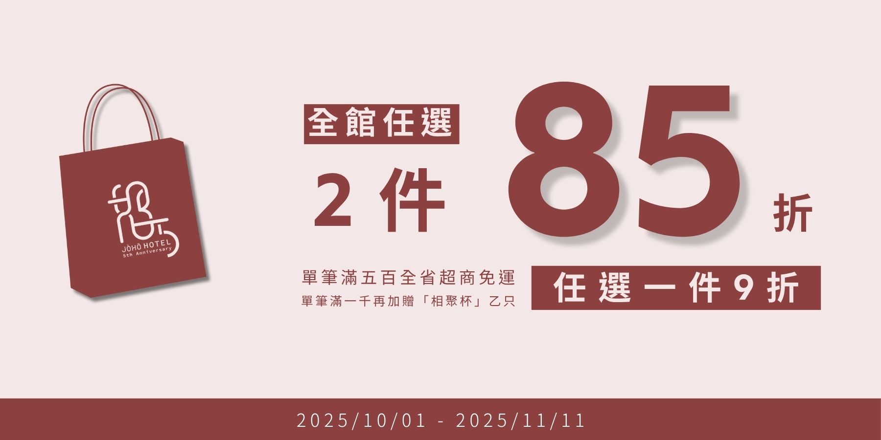 10/1 ~ 11/11 JÒHŌ Lé 周年慶,超商單筆消費滿500享免運,單筆滿1000,再送JÒHŌ五周年紀念啤酒杯